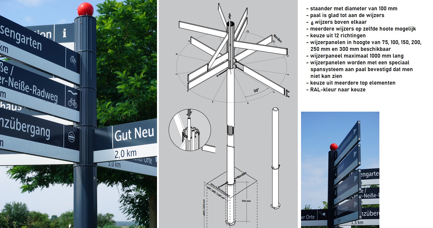 Rond aluminium handwijzerprofiel met een staander met een diameter van 100 mm. Paal is tot aan de wijzers glad. Er kunnen 6 wijzers boven elkaar geplaatst worden maar wel meerdere op gelijk hoogte. Men heeft 12 keuzes qua richting. De wijzers zijn beschikbaar in een hoogte van 75, 100, 150, 200, 250 en 300 mm met een maximale lengte van 1000 mm. De panelen worden met een vernuftig spansysteem aan de palen bevestigd zonder dat men dit kan zien. Men heeft tevens keuze in meerdere top elementen. Kan in elke gewenste RAL-kleur geleverd worden.Wilt u een prijs aanvragen?